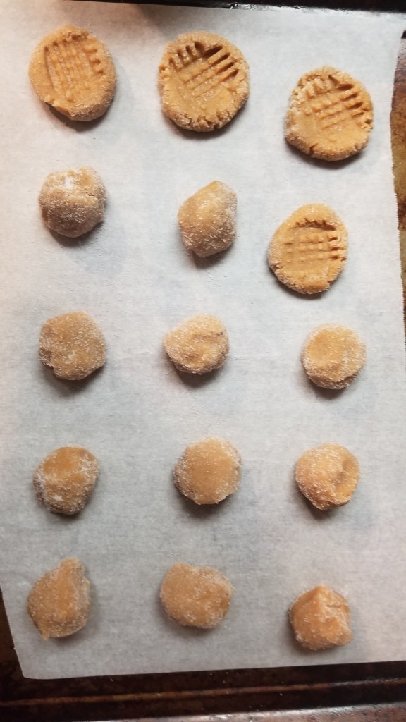 Mix egg, peanut butter, and sugar. Scoop and shape dough into a ball. Dip the ball in extra sugar. Press down ball of dough with crisscross pattern with fork. Bake on parchment paper 350 degrees, 8-9 minutes.